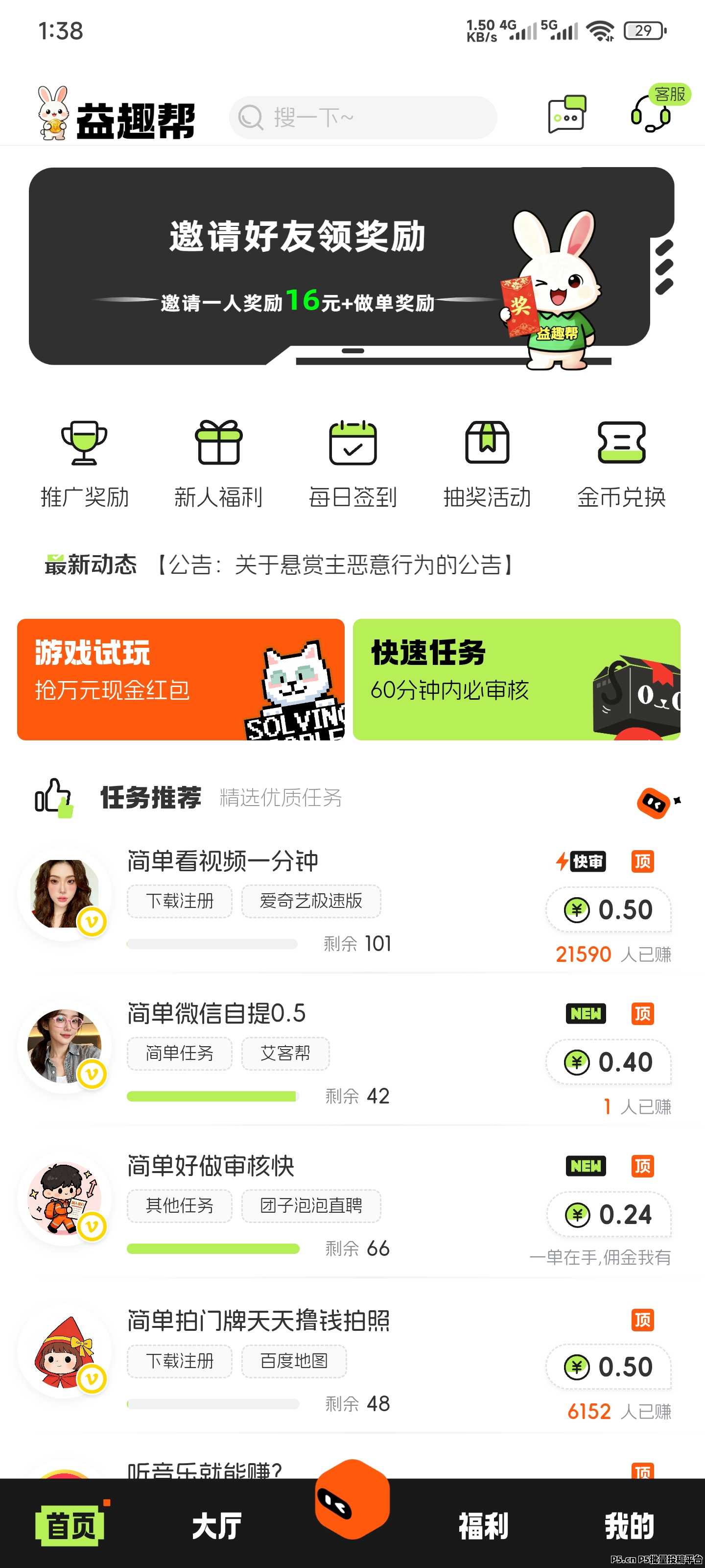 益趣帮是成都益趣帮网络科技有限公司开发的APP,2025年12月.19号最新上线的悬赏任务平台。每日为大家准备了注册、下载、砍价、投票、关注等类型的海量悬赏任务,我们只需要按照任务要求去完成任务就能拿到赏金奖励,不限制时间地点,不需要任何,完成的任务越多,赚到的奖励也就越多,多劳多得,非常适合学生党、宝妈等空闲时间较多的人群,还可以发布任务来赚差价,游戏试玩赚取佣金。